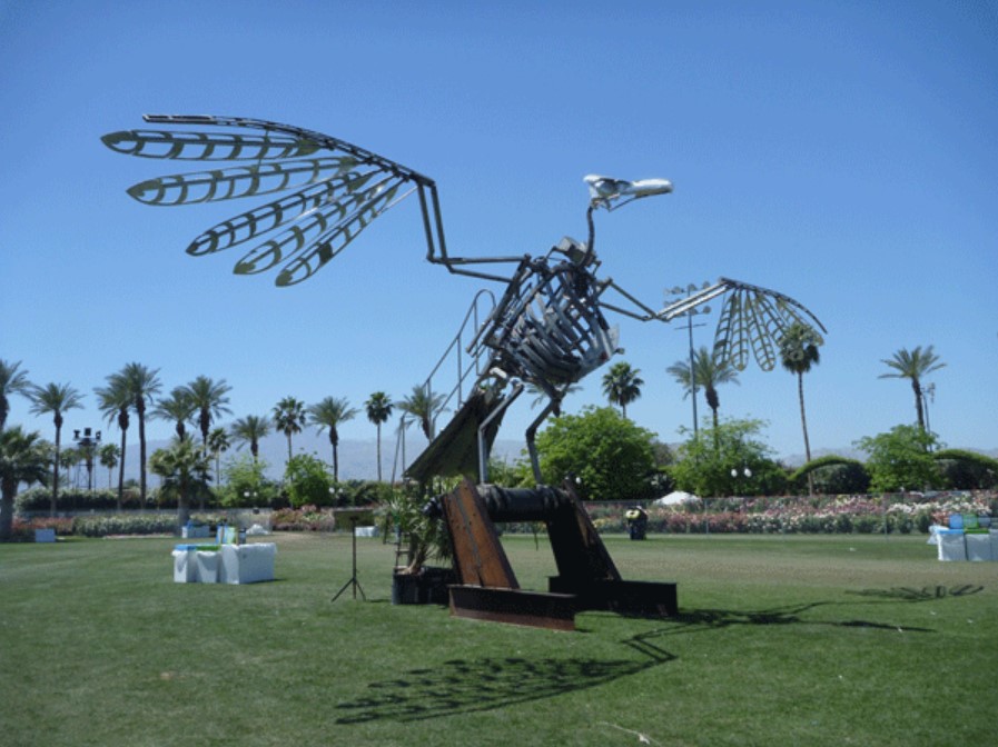 A large stainless steel mechanical bird. One person at a time may climb a staircase up the tail-feathers and climb into the ribcage, where they sit and assume the position of a recumbent rider. By pedaling a set of bicycle cranks, the operator sets in motion an intricate arrangement of chains, sprockets, gears, and cranks which causes he wings to open and close much as a real birds wings do.