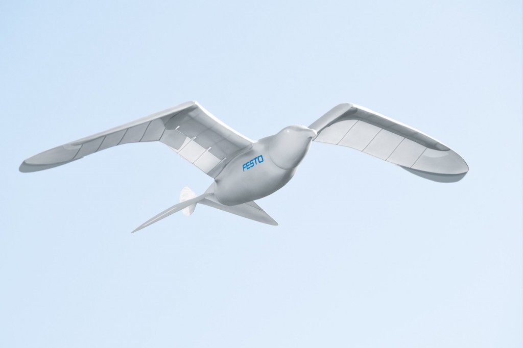 For the SmartBird, Festo was inspired by the herring gull. The ultralight flying model impresses with its outstanding aerodynamics and maximum agility and is able to take off, fly and land without an additional drive. In doing so, its wings not only beat up and down, but twist in a specific manner. This is done using an active articulated torsion drive, which provides both lift and propulsion. With this functional integration, Festo has technically deciphered bird flight. In combination with complex regulation systems, flight efficiency of a degree previously thought of as unattainable has been realised and ensured through ongoing diagnosis: during the flight, data such as wing position and battery charge status are continuously recorded and monitored in real-time.