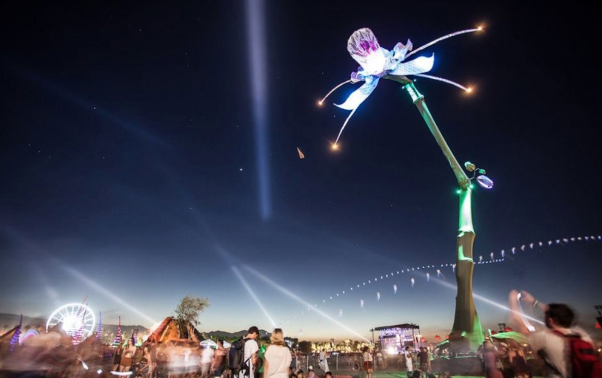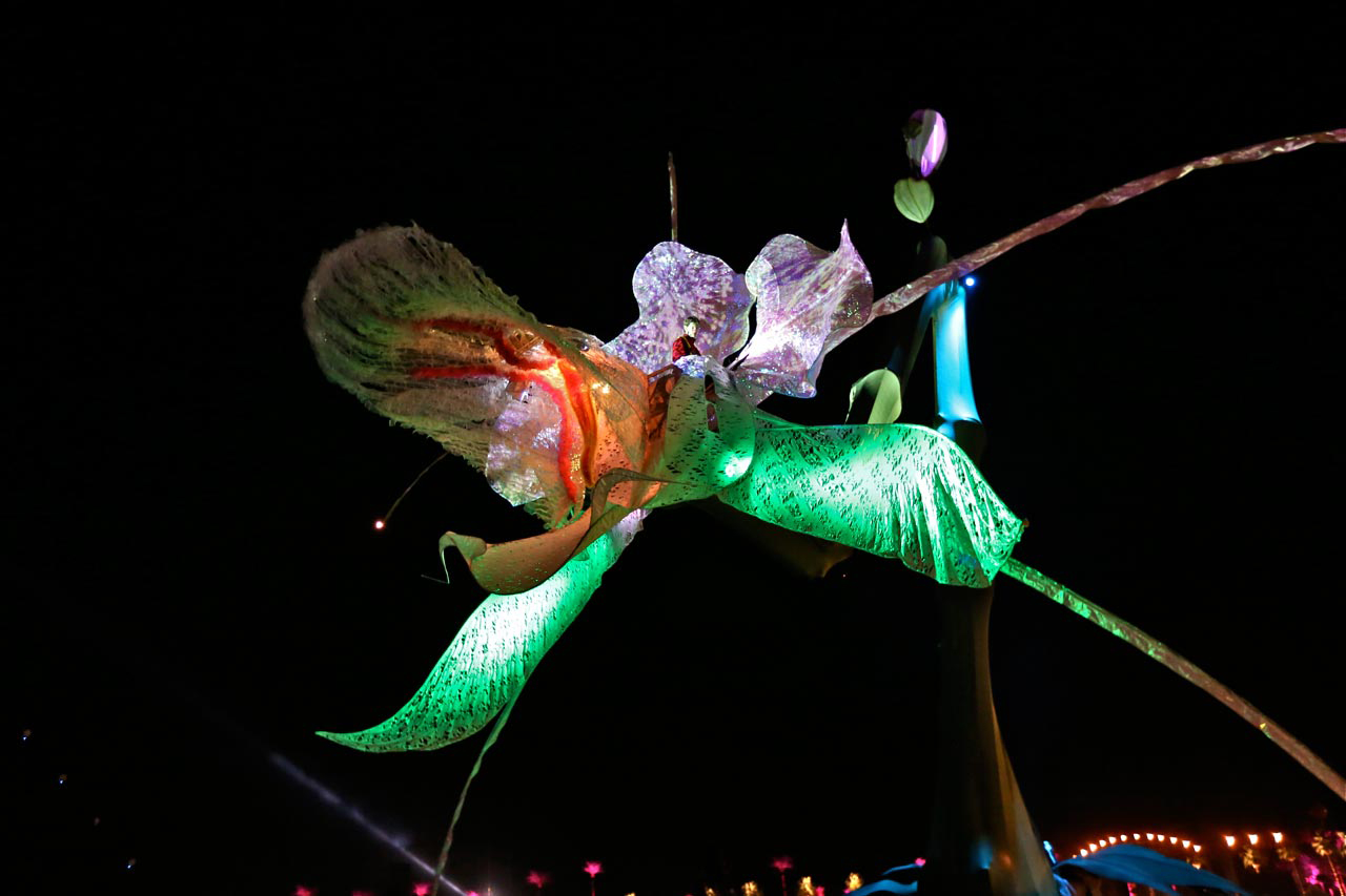Solitary Inflorescence was the realization of a long time dream to re-engineer our 80′ giant flowers to fit the taller 125′ articulating aerial man lifts. The flower’s petals are composed of hand formed steel and aluminum tubing with custom sewn & draped fabric panels. The sculpture features color changing LED lighting and video projection onto the petal surfaces.